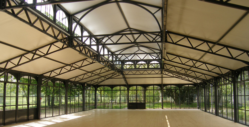 - Toit à 4 pans dépassant de la structure, tendu par des barres métalliques