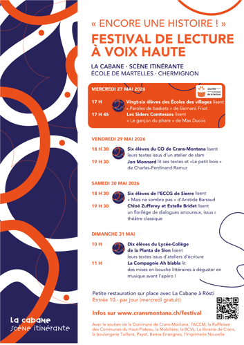 Dans la cour de récréation de l'école de Martelles à Chermignon-d'en-bas, enfants et adultes pourront se régaler du mercredi après-midi au dimanche matin avec des prestations de comédiens professionnels mais aussi, nouveauté pour cette édition, des lectures de jeunes de 7 à 20 ans issus des écoles de la région (primaire, cycle d’orientation, ECCG et lycée-collège) !