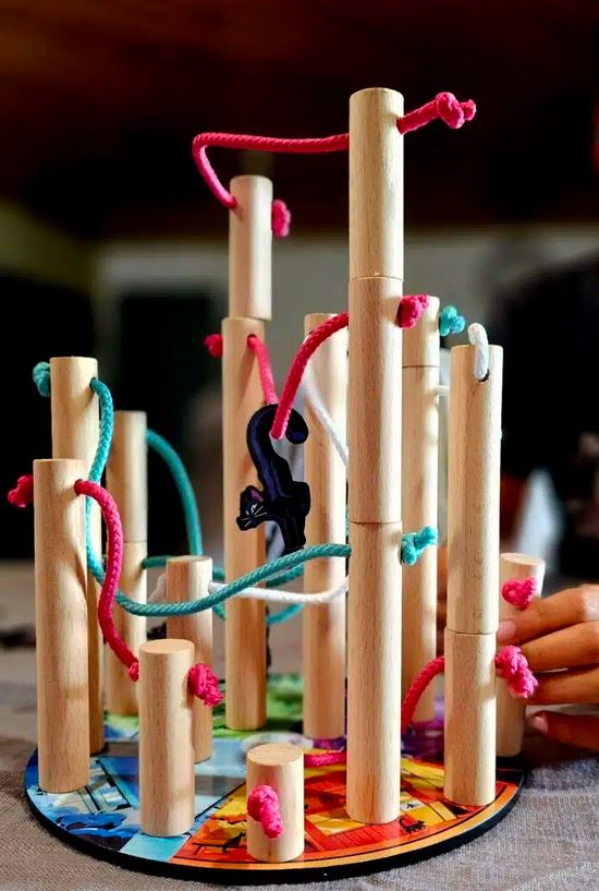 Deux modes de jeu sont possibles : coopératif ou compétitif. Soit on s’entraide pour arriver à placer les poteaux et les chats, soit on tend des pièges pour que nos adversaires fassent tomber la structure.