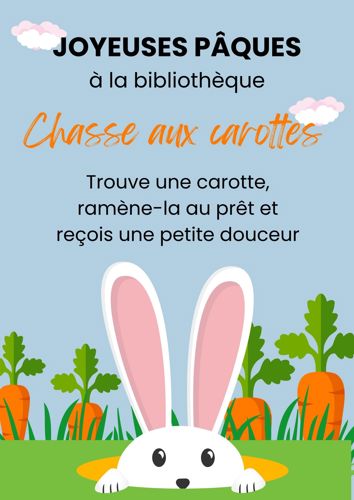 Le lapin de Pâques a égaré ses carottes dans l'espace jeunesse de la bibliothèque ! Trouve une carotte et reçois une petite friandise !