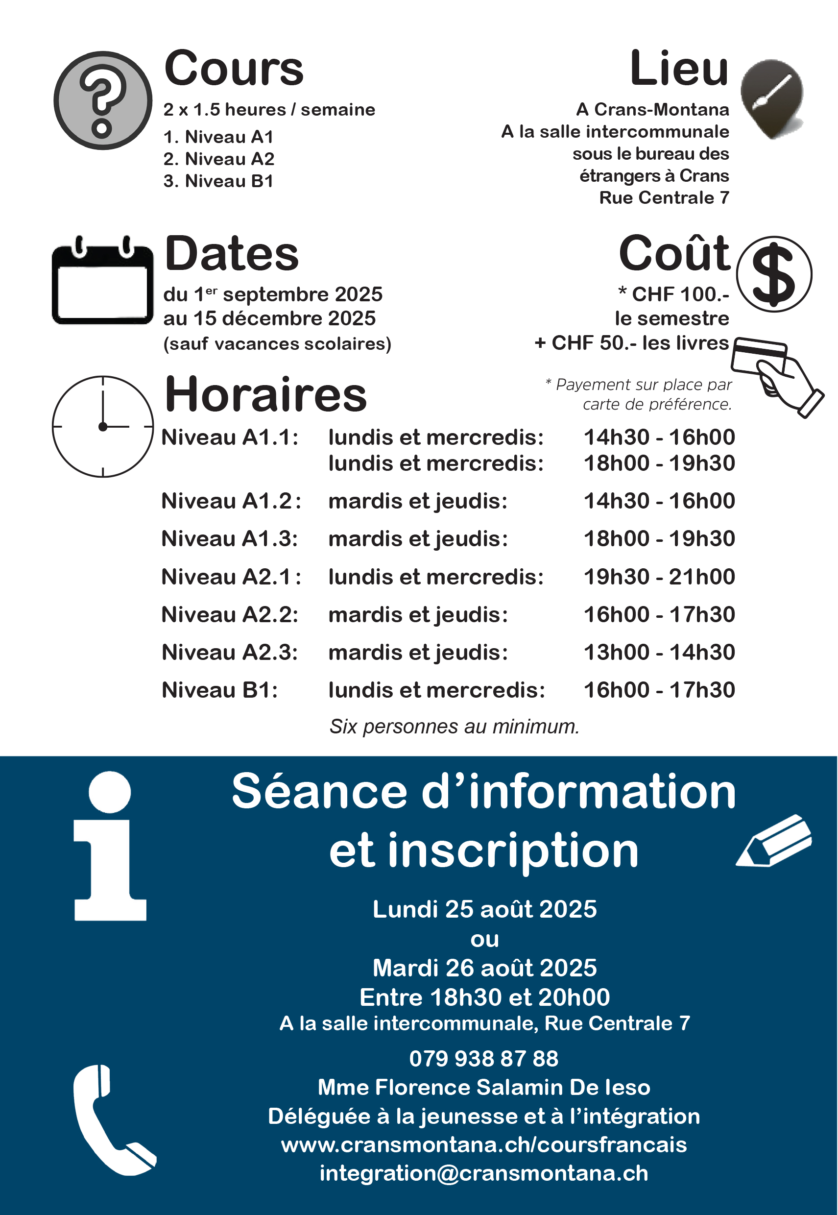 Les personnes allophones (qui ne parlent pas le français) établis sur le territoire de Crans-Montana et qui vont y travailler durant une saison, une année ou pour plus de temps, peuvent participer à des cours de français. Ces cours pour adultes migrants se déroulent par session : une au printemps et une en automne.
