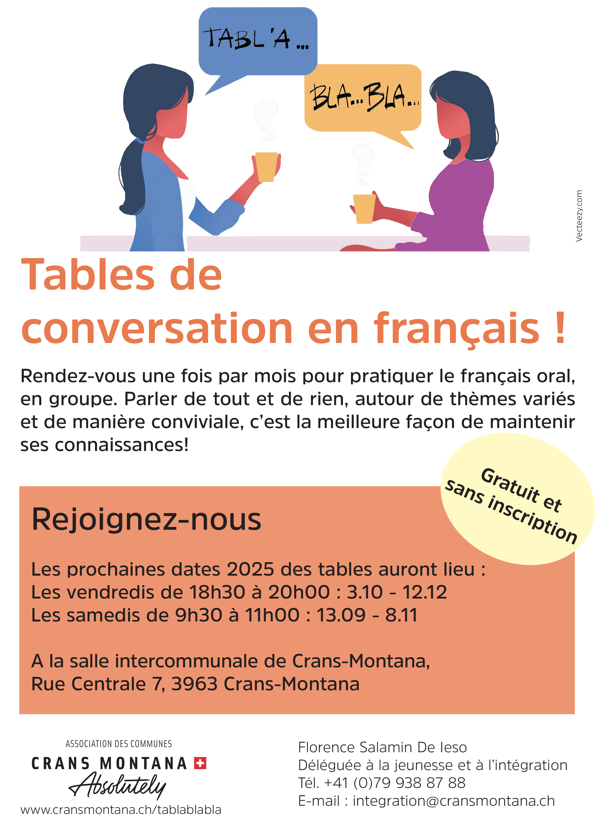 Rendez-vous à la salle intercommunale de Crans-Montana, rue centrale 7, 3963 Crans-Montana, soit à 11h (les samedis) soit à 20h (les vendredis).