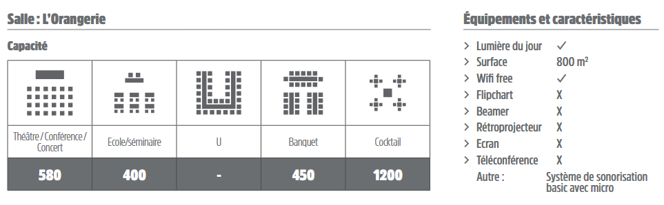 1 journée : 24 heures. La prise de possession de l'orangerie est possible dès 6h et il faut rendre l'orangerie à 6h. Les manifestations ne peuvent se tenir que jusqu'à 22h.