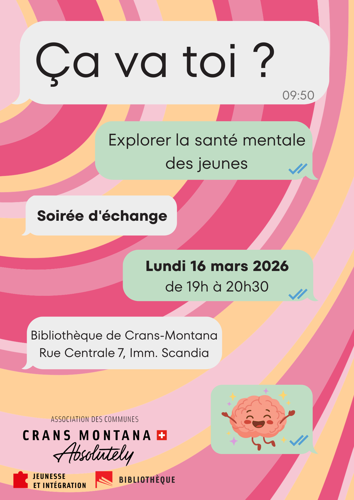 Dans le cadre de l’exposition « Ça va toi ? », consacrée à la santé mentale des jeunes, une soirée d’échange sur ce thème est organisée le lundi 16 mars de 19h00 à 20h30 à la bibliothèque de Crans-Montana.